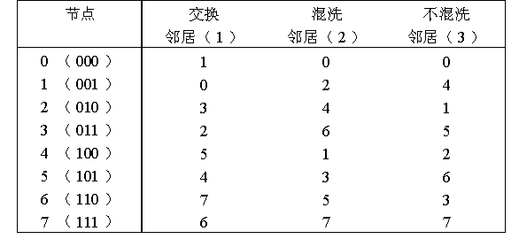 例6.3 假设comm是一个带有混洗交换拓扑的通信子。组有2n个成员。每一进程标号为,其中而且有三个邻居:exchangeshuffle()=unshuffle。图相连表解释如下,n=3
