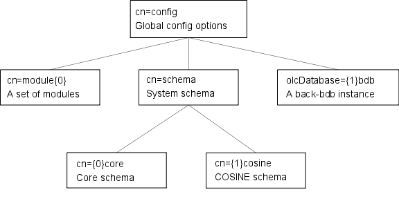 The slapd-config configuration tree has a very specific structure. The root of the tree is named cn=config and contains global configuration settings. Additional settings are contained in separate child entries:
