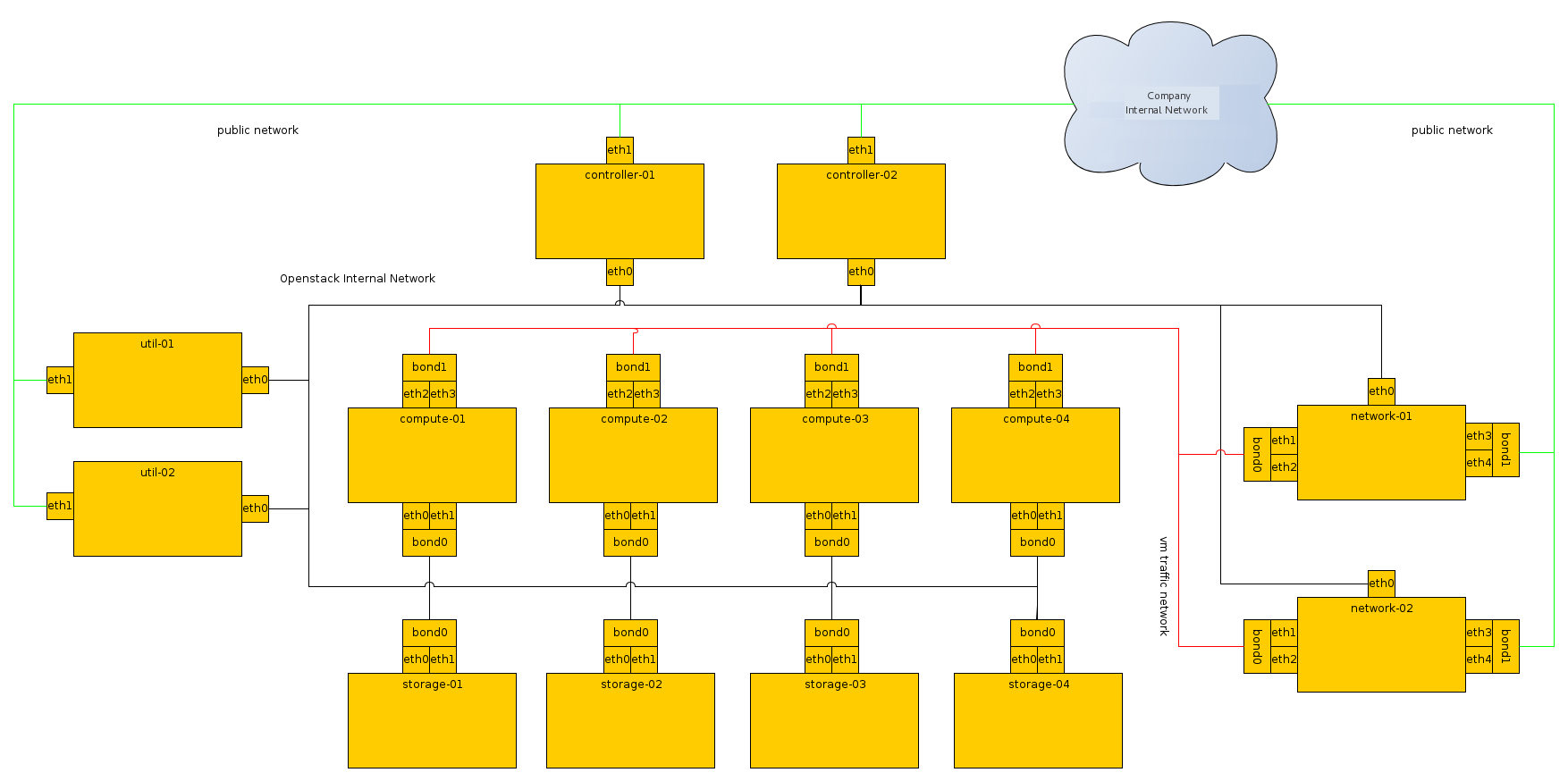 This network is connected to the controller nodes so users can access the OpenStack interfaces, and connected to the network nodes to provide VMs with publicly routable traffic functionality. The network is also connected to the utility machines so that any utility services that need to be made public (such as system monitoring) can be accessed.