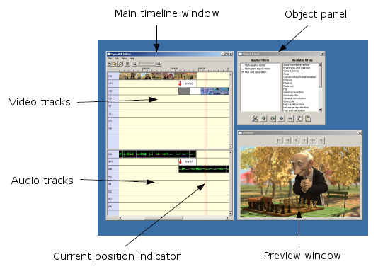 The main application window is the timeline window. The timeline is a repository used to store data that will be processed. It is divided into a video part and an audio part; each of these parts consists of several horizontal tracks.