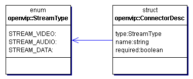 Each connector must be given a name (e.g. audio0, video0 etc.) and a flag whether the module requires that the connector must be linked to another module. In addition it is necessary to specify the corresponding stream type. Recall that OpenVIP supports three data types: video frames, audio buffers, and data packets (see Data types in OpenVIP). Stream type STREAM_VIDEO then means that the corresponding connector can transport video frames, STREAM_AUDIO transports only audio buffers, and finally STREAM_DATA supports only data packets.