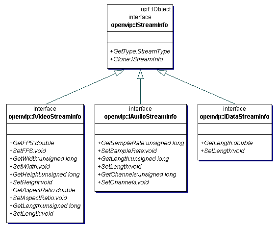 For a STREAM_VIDEO stream the module supplies a VideoStreamInfo object with information about the video frames it will produce including their dimensions, frame rate, aspect ratio and the total number of frames. An AudioStreamInfo object corresponds to a STREAM_AUDIO stream and contains the sample rate, the number of audio channels, and the total number of samples. A DataStreamInfo object simply provides an information about the length of STREAM_DATA stream in seconds.