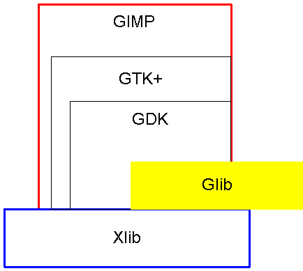 GNOME在1997年启动,当时有一个Linux上有一个软件GIMP(GNU Image Manipulation Program,由Berkeley的两个人,Spencer Kimball & Peter Mattis完成)在图像处理方面相当出色,因为GNOME是一个图形化的用户接口,因此以GIMP为基础是很自然的事。GIMP的层次结构如下: