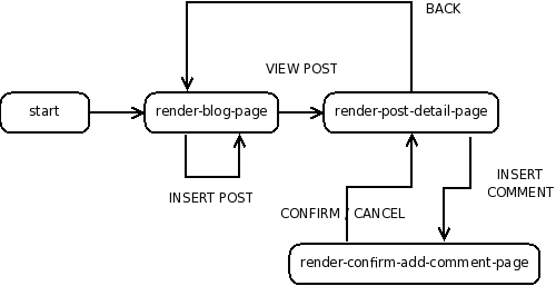 You may have noticed a problem when trying to update post-insert-comment!: the function has no blog to pass to save-blog!. We will therefore need to give it a blog argument and change the application appropriately. While we’re at it, let’s change blog-insert-post! to accept the contents of the post structure, rather the structure itself. This improves the model’s interface, by making it more abstract: